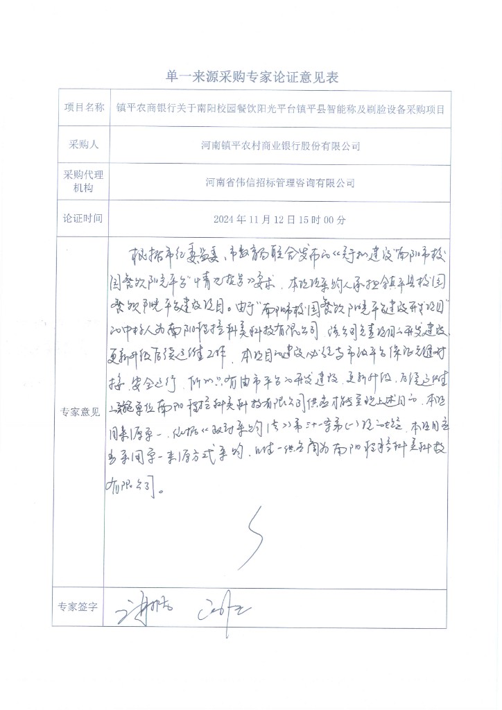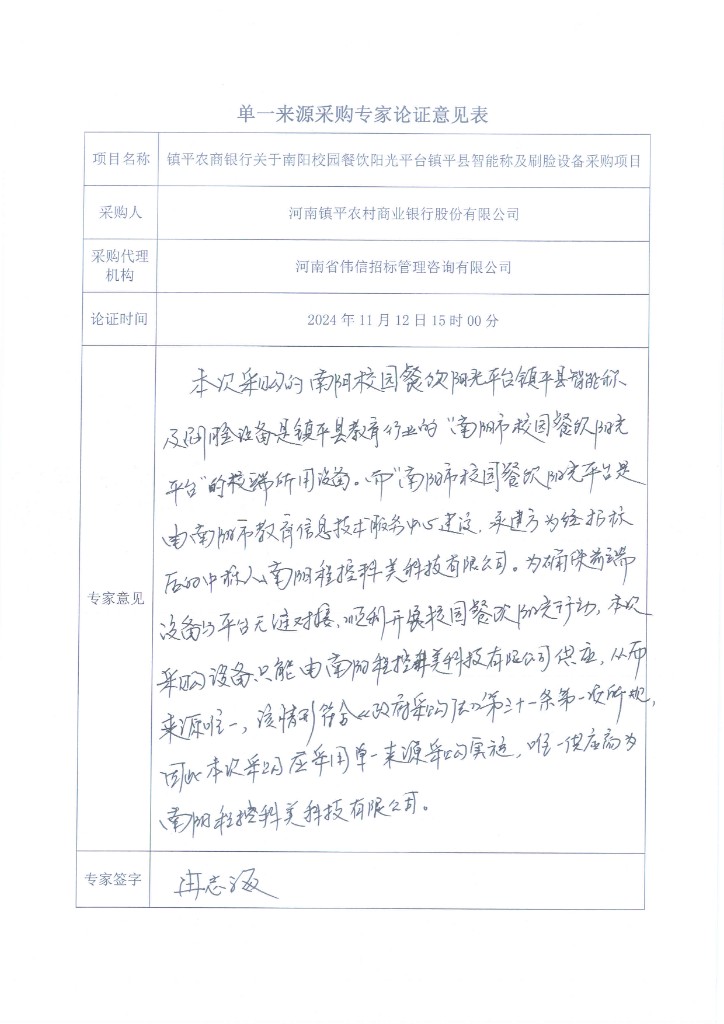 為促進(jìn)我行業(yè)務(wù)發(fā)展,根據(jù)中共南陽市紀(jì)律檢查委員會、南陽市監(jiān)察委員會、南陽市教育局聯(lián)合發(fā)布的《關(guān)于擬建設(shè)“南陽市校園餐飲陽光平臺”情況報(bào)告》要求,我行承擔(dān)鎮(zhèn)平縣校園餐飲陽光平臺建設(shè)項(xiàng)目。經(jīng)考察查證,2024年08月15日南陽市教育信息技術(shù)服務(wù)中心已對“南陽市校園餐飲陽光平臺建設(shè)開發(fā)服務(wù)項(xiàng)目”進(jìn)行了招標(biāo),中標(biāo)人為南陽程控科美科技有限公司,該公司負(fù)責(zé)該項(xiàng)目的開發(fā)建設(shè)、更新升級及后續(xù)運(yùn)維工作。在本項(xiàng)目中,智能收貨終端及人臉識別終端作為關(guān)鍵硬件組成部分且需與平臺系統(tǒng)實(shí)現(xiàn)無縫對接、互聯(lián)互通,以確保食材收貨流程的順暢與穩(wěn)定。南陽程控科美科技有限公司的智能收貨終端及人臉識別終端已經(jīng)過測試,并與“南陽市校園餐飲陽光平臺”系統(tǒng)實(shí)現(xiàn)了完美對接。這些設(shè)備在功能、性能及接口標(biāo)準(zhǔn)上均符合平臺要求,具有高度的兼容性和穩(wěn)定性。為確保項(xiàng)目實(shí)施的連續(xù)性和穩(wěn)定性,避免因設(shè)備更換帶來的技術(shù)風(fēng)險(xiǎn)和時(shí)間成本,依據(jù)“《中華人民共和國政府采購法》第三十一條(一)只能從唯一供應(yīng)商處采購的;”規(guī)定,本項(xiàng)目擬采用單一來源采購方式進(jìn)行采購。