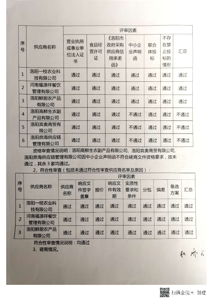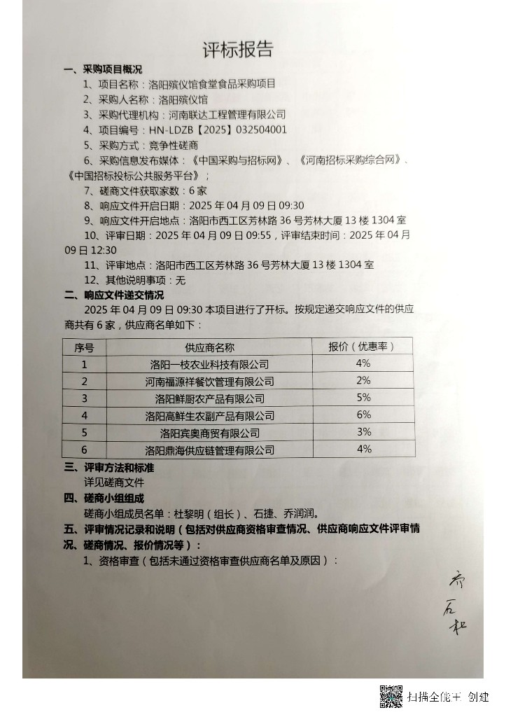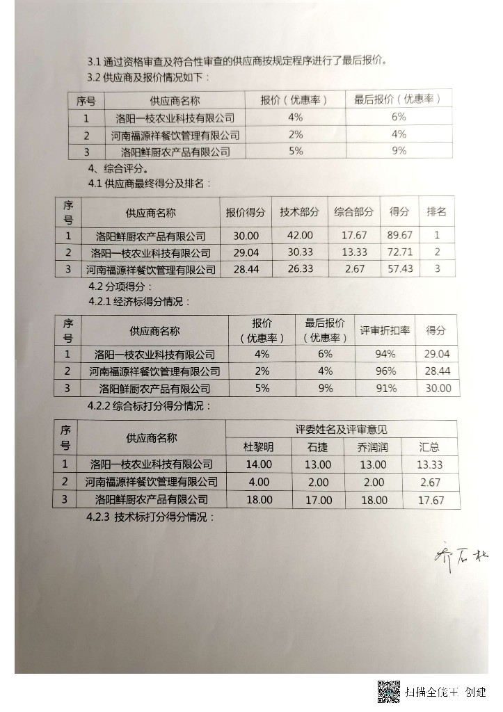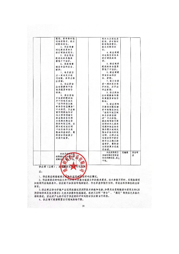 1 | 本項(xiàng)目為洛陽殯儀館食堂食品采購項(xiàng)目,主要采購(含配送)肉、雞蛋、蔬菜、水果、調(diào)味品及其它副食品,具體要求詳見磋商文件; | 洛陽鮮廚農(nóng)產(chǎn)品有限公司 | 河南省洛陽市老城區(qū)國花路營莊工業(yè)園東區(qū)3排A棟108室 | 9 | % |