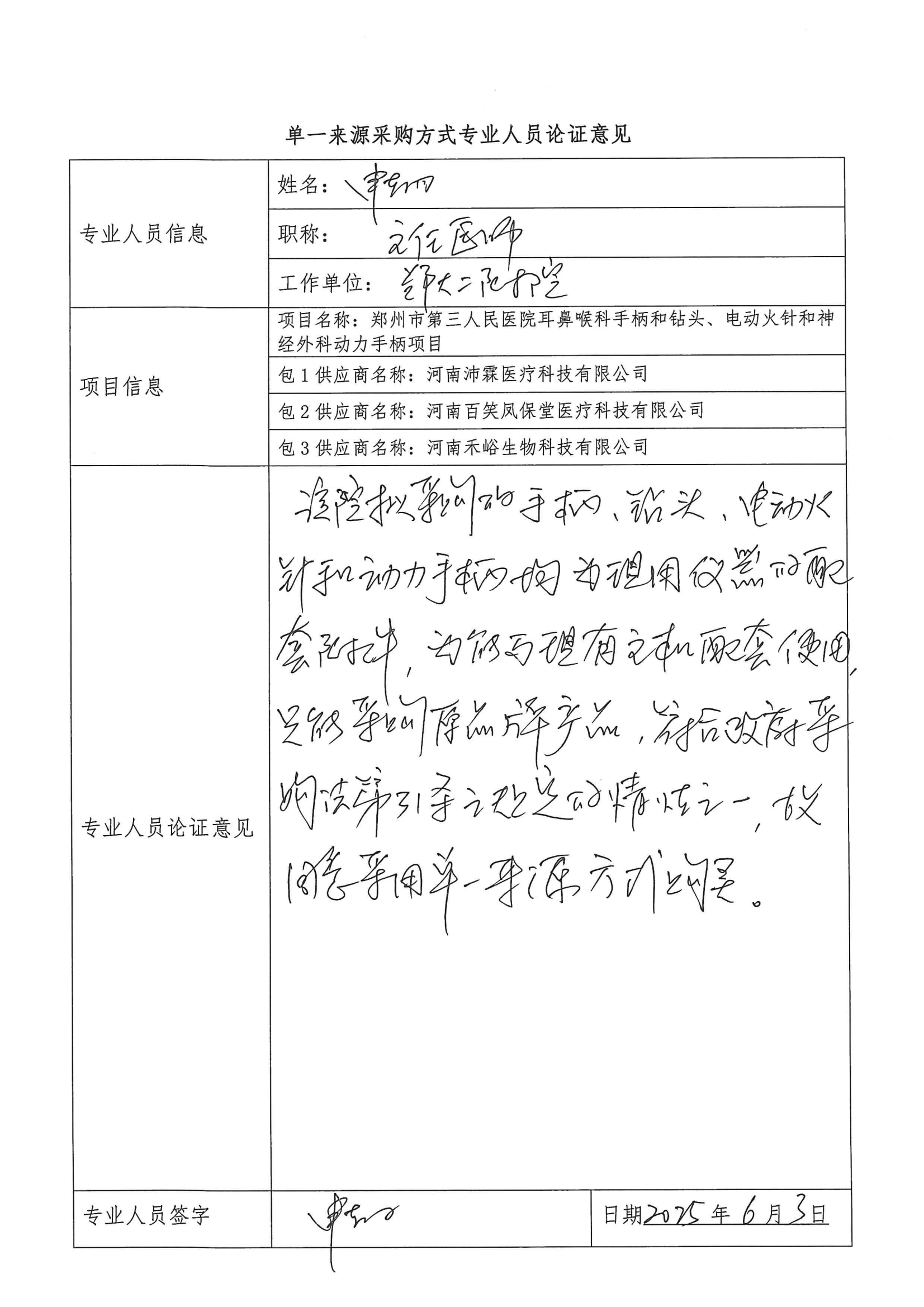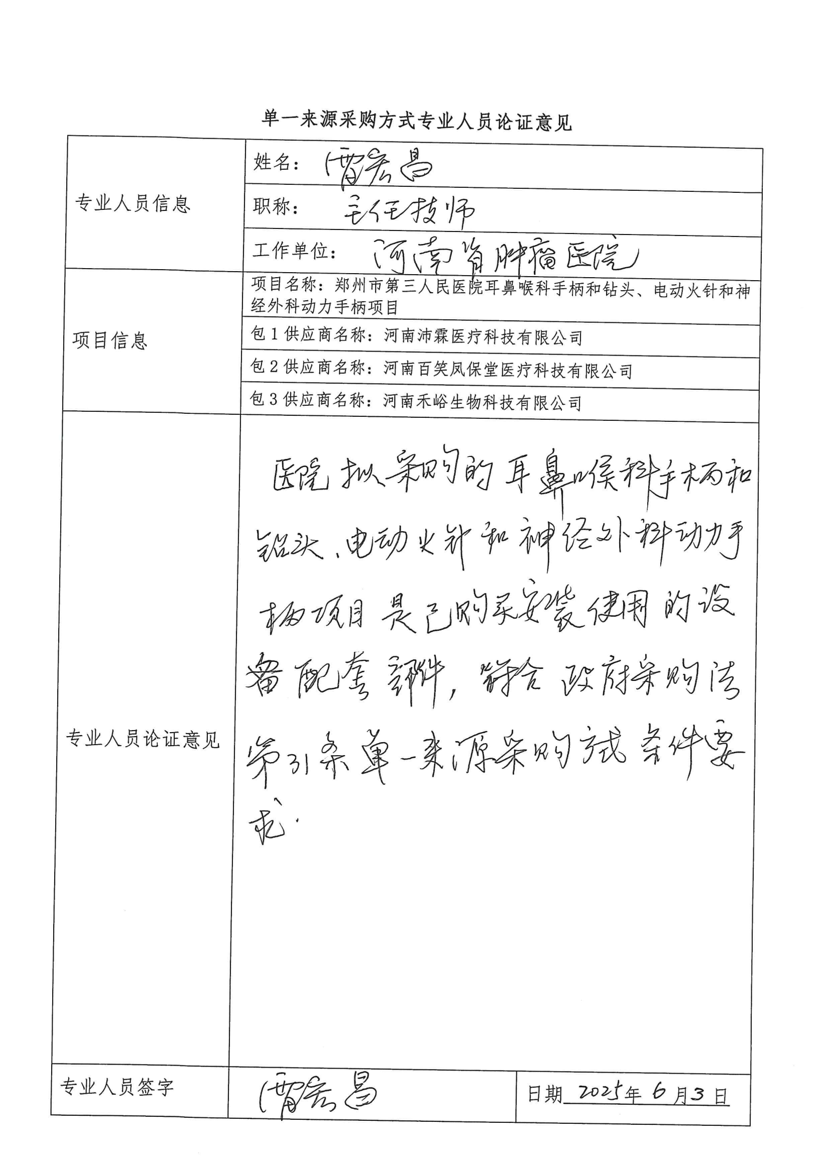鄭州市第三人民醫(yī)院采購(gòu)的耳鼻喉科手柄和鉆頭、電動(dòng)火針和神經(jīng)外科動(dòng)力手柄均需與相應(yīng)主機(jī)配套使用,按照《醫(yī)療器械監(jiān)督管理?xiàng)l例》的要求,必須從原廠家采購(gòu),河南沛霖醫(yī)療科技有限公司、河南百笑鳳保堂醫(yī)療科技有限公司、河南禾峪生物科技有限公司分別為上述設(shè)備的指定代理商,該項(xiàng)目具備唯一性。符合中華人民共和國(guó)政府采購(gòu)法第三十一條中第一條規(guī)定,只能從唯一供應(yīng)商購(gòu)買。