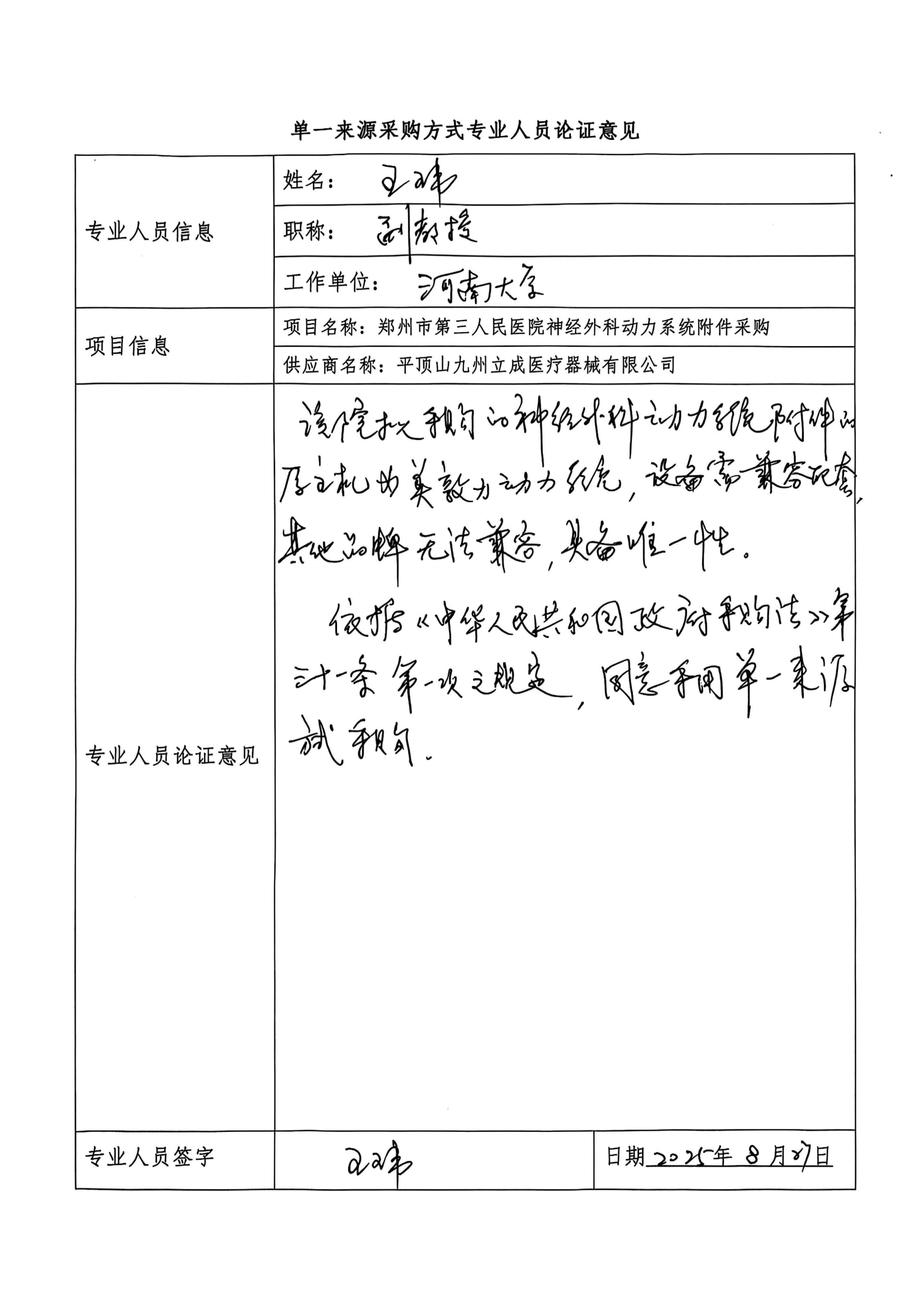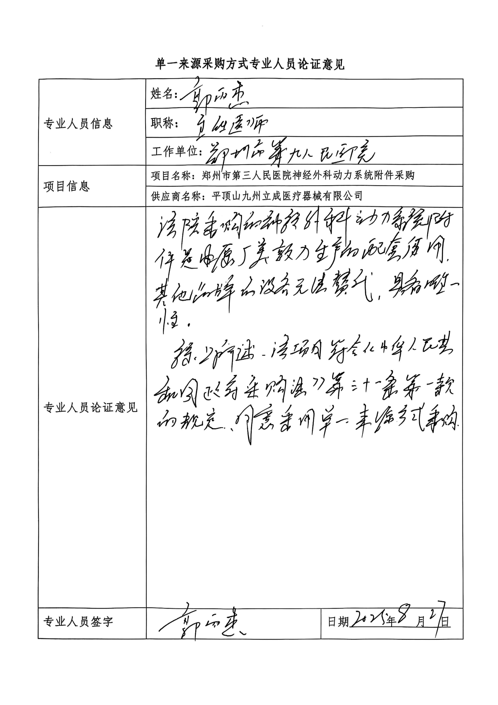 鄭州市第三人民醫(yī)院神經外科動力系統(tǒng)附件采購需與相應主機配套使用,其他品牌無法兼容,必須從原廠家采購,平頂山九州立成醫(yī)療器械有限公司為上述設備的指定代理商,該項目具備唯一性。符合中華人民共和國政府采購法第三十一條中第一款規(guī)定,只能從唯一供應商采購的。