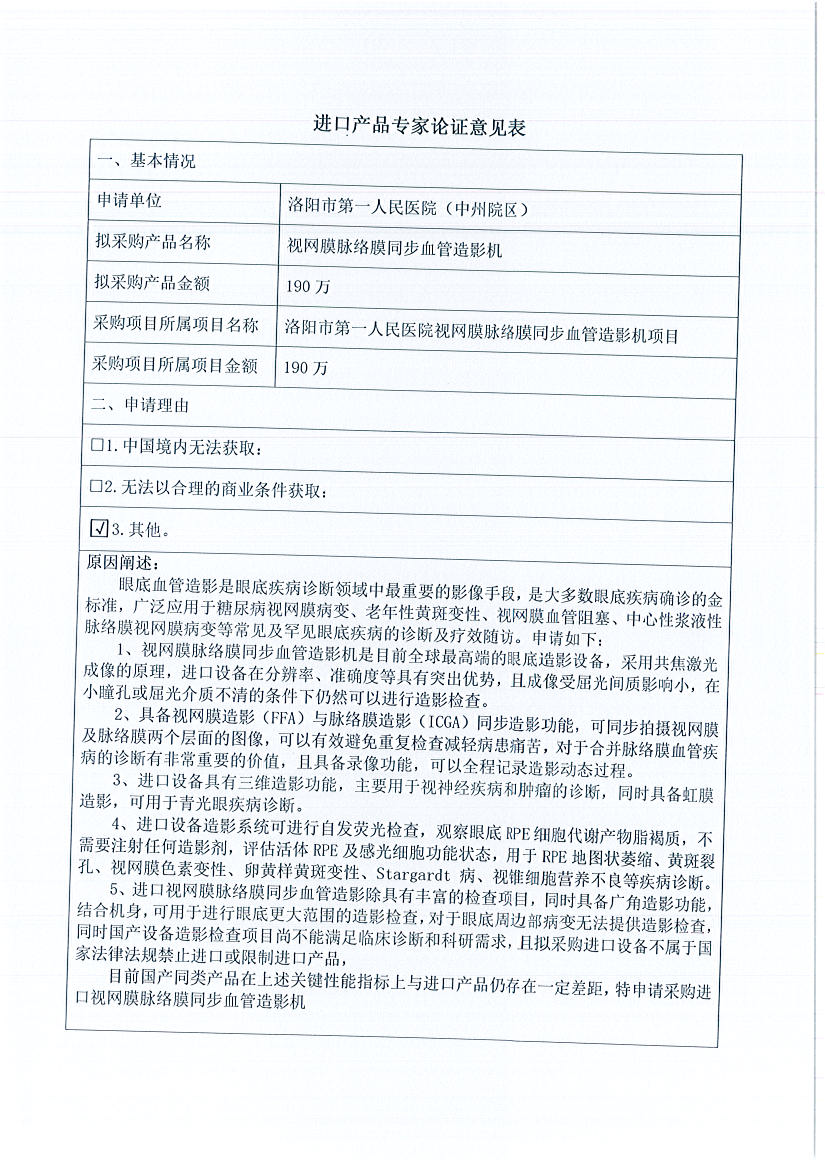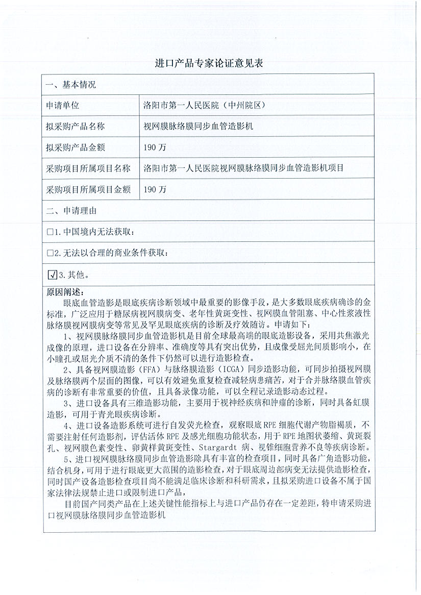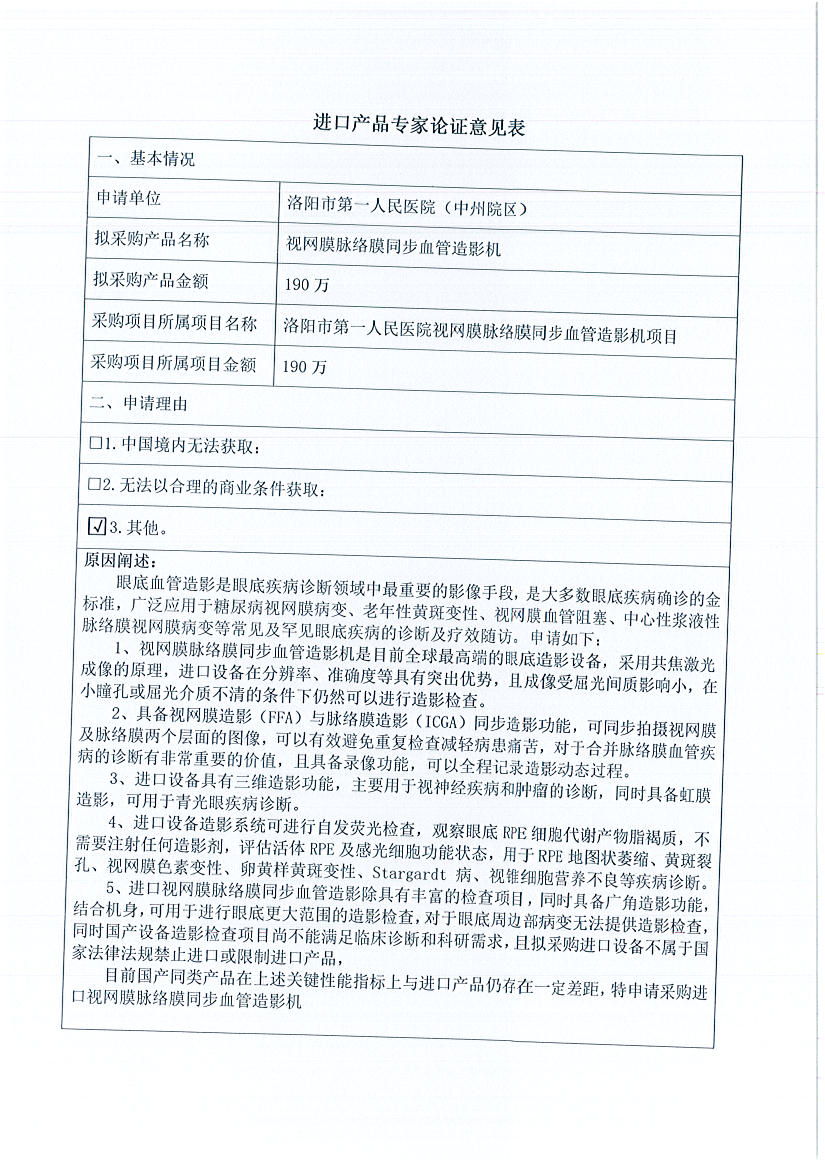 1.項目名稱:洛陽市第一人民醫(yī)院(中州院區(qū))視網(wǎng)膜脈絡膜同步血管造影機項目