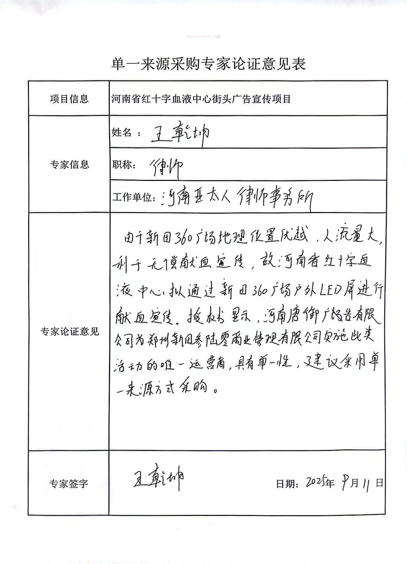 新田360廣場人流量大、戶外LED屏亮屏?xí)r間長,滿足無償獻(xiàn)血宣傳條件,根據(jù)鄭州新田叁陸零商業(yè)管理有限公司對河南唐御廣告有限公司戶外廣告發(fā)布業(yè)務(wù)的唯一授權(quán)委托書,河南唐御廣告有限公司具有本項目所需的唯一性、獨家性。根據(jù)《中華人民共和國政府采購法》第三十一條“符合下列情形之一的貨物或者服務(wù),可以依照本法采用單一來源方式采購: (一) 只能從唯一供應(yīng)商處采購的; (二) 發(fā)生了不可預(yù)見的緊急情況不能從其他供應(yīng)商處采購的;(三) 必須保證原有采購項目一致性或者服務(wù)配套的要求,需要繼續(xù)從原供應(yīng)商處添購,且添購資金總額不超過原合同采購金額百分之十的?!北卷椖窟m用于第三十一條中第一條,擬采用單一來源采購方式向河南唐御廣告有限公司采購。