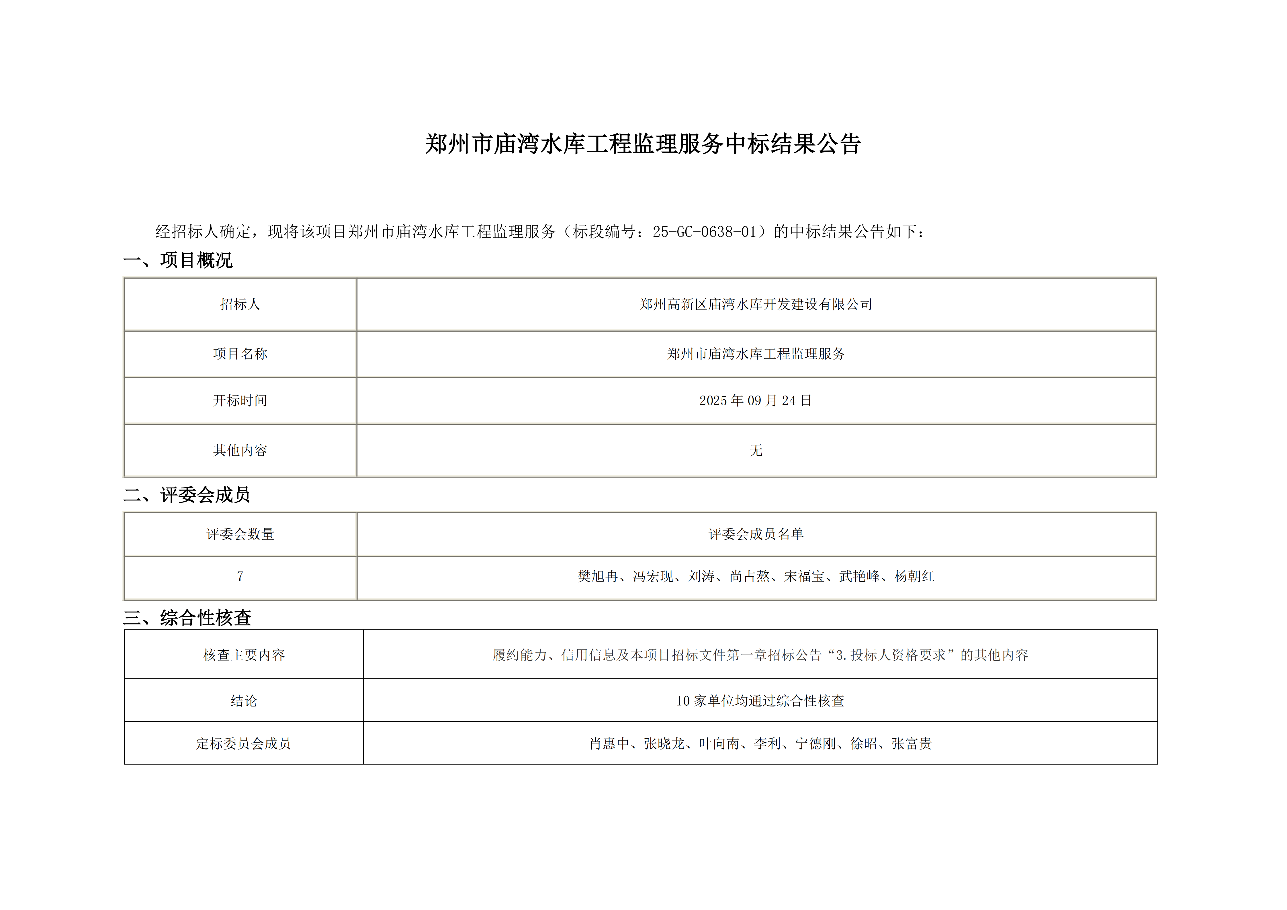 鄭州市廟灣水庫(kù)工程監(jiān)理服務(wù)中標(biāo)結(jié)果公告