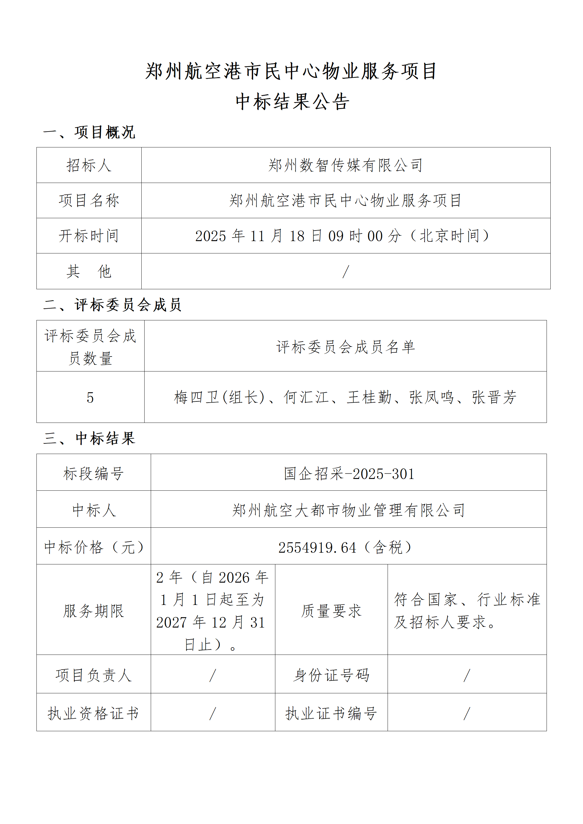 鄭州航空港市民中心物業(yè)服務(wù)項(xiàng)目中標(biāo)結(jié)果公告