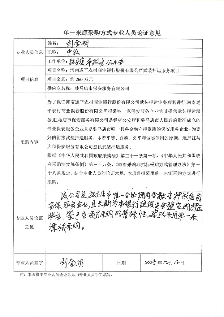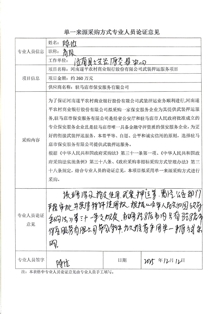 為了保證河南遂平農(nóng)村商業(yè)銀行股份有限公司武裝押運(yùn)業(yè)務(wù)順利進(jìn)行,河南遂平農(nóng)村商業(yè)銀行股份有限公司擬采購一家保安服務(wù)企業(yè)為其提供武裝押運(yùn)服務(wù),駐馬店市保安服務(wù)有限公司是經(jīng)省公安廳和駐馬店市人民政府批準(zhǔn)成立的專業(yè)保安服務(wù)企業(yè)且是駐馬店市唯一具備金融守押資質(zhì)的保安服務(wù)企業(yè),為更好的銜接武裝押運(yùn)服務(wù),本著平等、自愿、公平和誠實(shí)信用的原則,選擇駐馬店市保安服務(wù)有限公司提供武裝押運(yùn)服務(wù)。