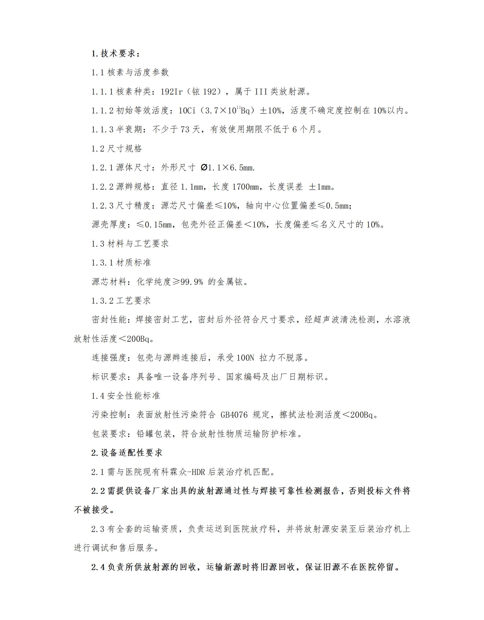 2.擬采購(gòu)的貨物或服務(wù)的說(shuō)明:放療科后裝機(jī)用于疾病治療專(zhuān)用耗材銥-192半衰期較短,為滿(mǎn)足目前我院臨床需求一年需要采購(gòu)兩顆。服務(wù)期3年,根據(jù)放射源的特殊管理要求,放射源需要定期更換并回收舊源,運(yùn)輸需要專(zhuān)用儲(chǔ)存裝置和專(zhuān)用運(yùn)輸車(chē)輛,安裝需要專(zhuān)業(yè)人員安裝,專(zhuān)業(yè)檢測(cè)工具等,放射源供應(yīng)商需同時(shí)具備以上相關(guān)資質(zhì)。為降低風(fēng)險(xiǎn),方便管理。