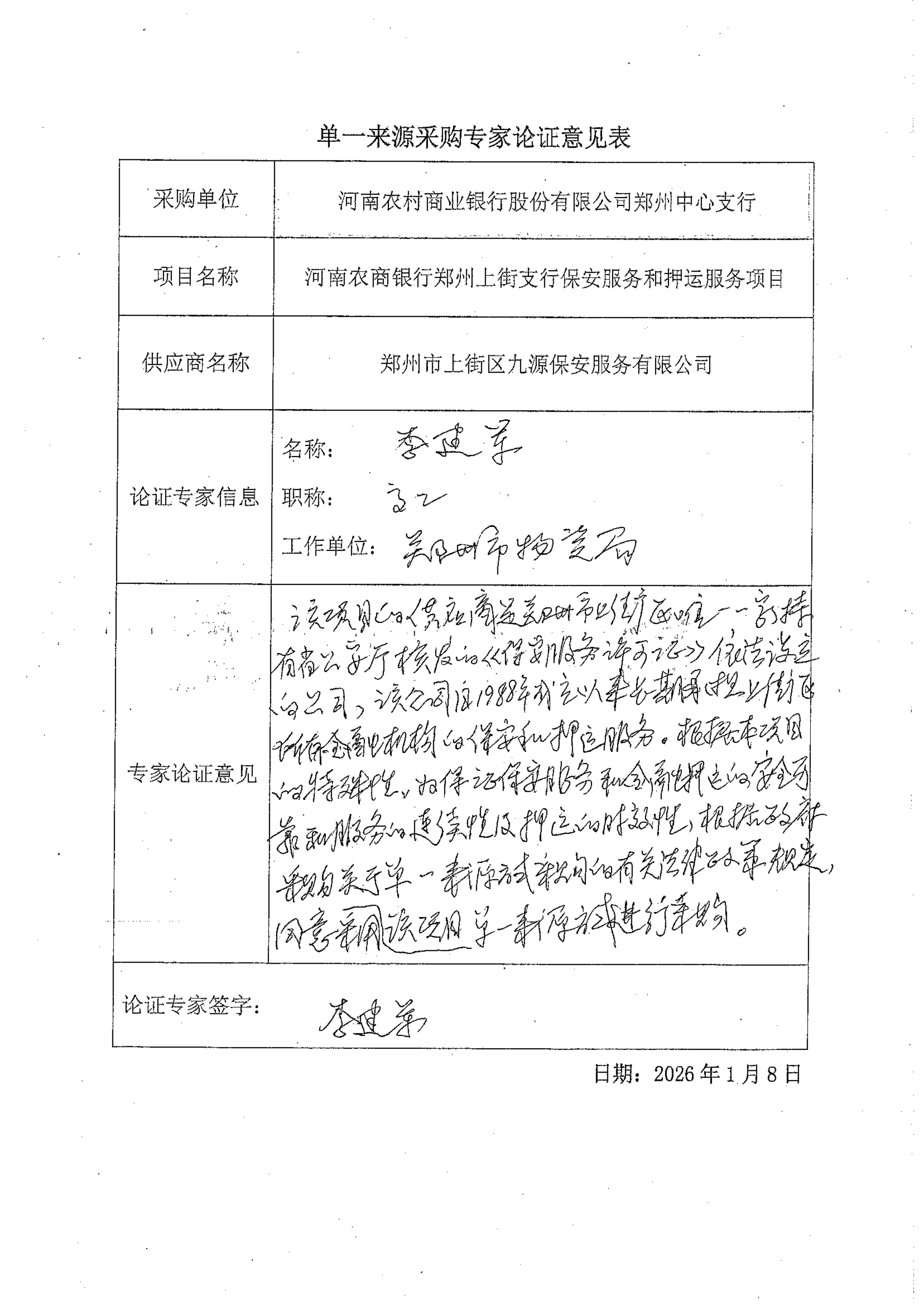 自上街區(qū)銀行業(yè)保安和押運服務實行社會化服務外包以來,所有銀行網點的相關業(yè)務均由該公司獨家、連續(xù)提供,保障了上街區(qū)金融安全秩序的穩(wěn)定。因此,基于其獨特的市場地位及長期的服務歷史,擬推薦鄭州市上街區(qū)九源保安服務有限公司為河南農商銀行鄭州上街支行保安服務和押運服務項目的唯一供應商。經專家論證根據該項目采購需求,向鄭州市上街區(qū)九源保安服務有限公司進行單一來源采購。